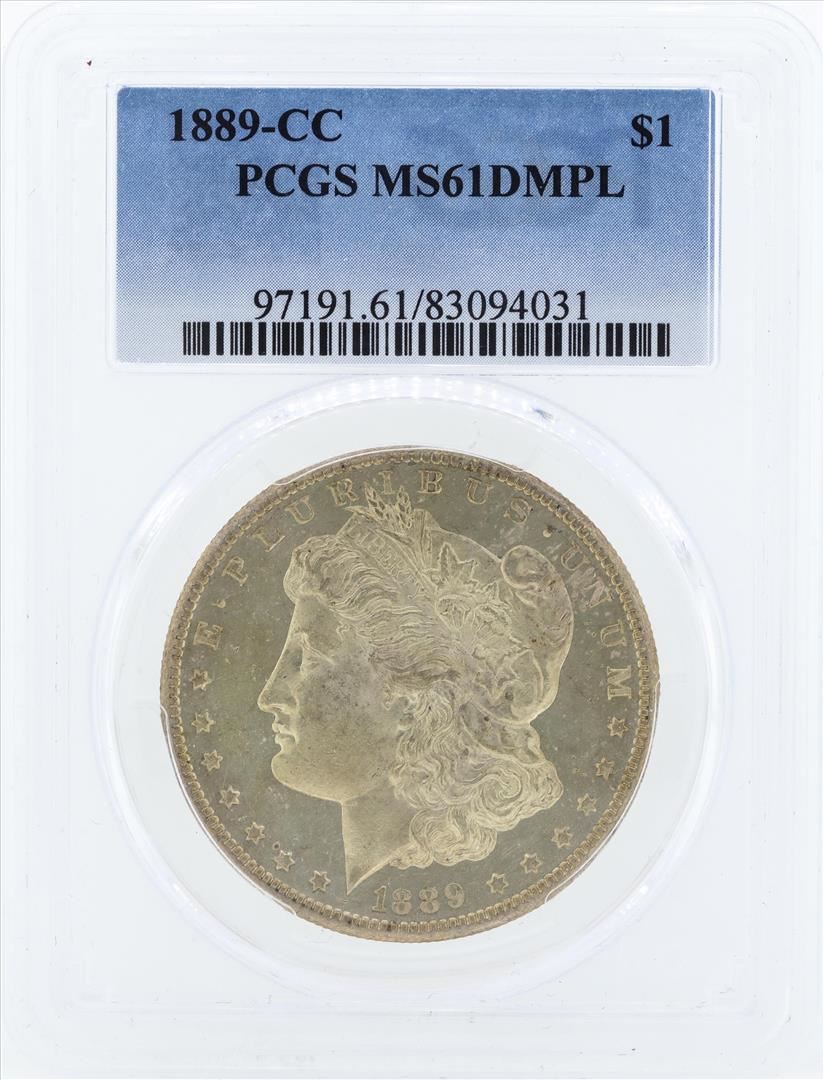 One 1889-CC $1 Morgan Silver Dollar Coin PCGS MS61DMPL. The 1889-CC had a limited mintage of only 350,000 pieces since it didn't start production until late October of that year due to the prior 4 year closure on the Carson City Mint. Due to the low mintage a large percentage of this mintage were placed into circulation making these uncirculated pieces rare at all levels. PCGS Graded.