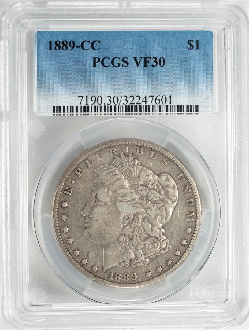 One 1889-CC $1 Morgan Silver Dollar Coin PCGS VF30. PCGS Graded.