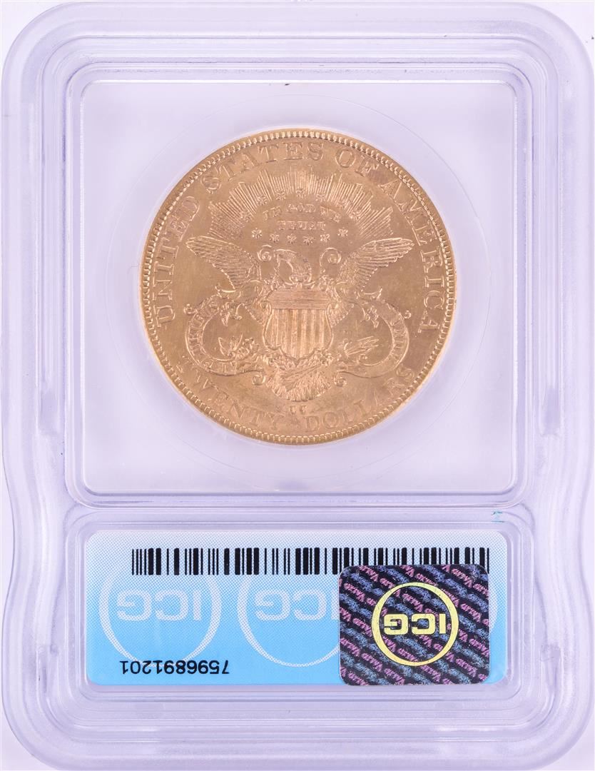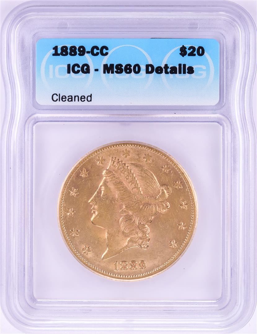 One 1889-CC $20 Liberty Head Double Eagle Gold Coin ICG MS 60 Details. ICG Certified.