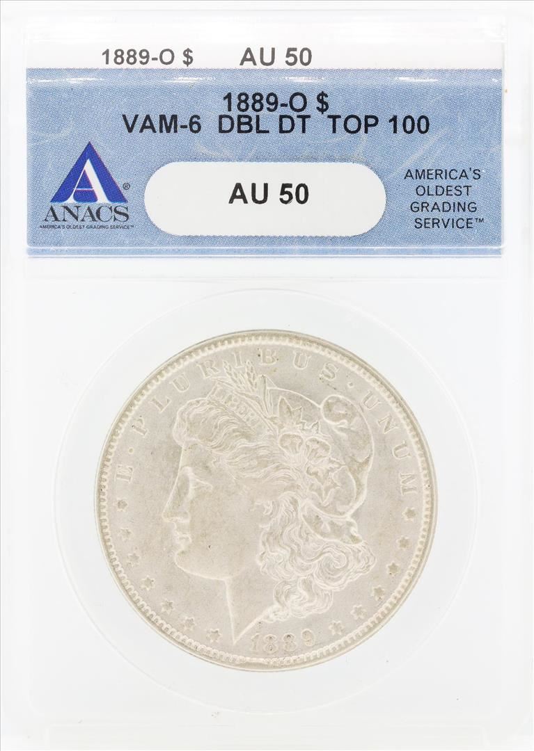 One 1889-O $1 Morgan Silver Dollar Coin VAM-6 Double DT ANACS AU50. ANACS Certified.