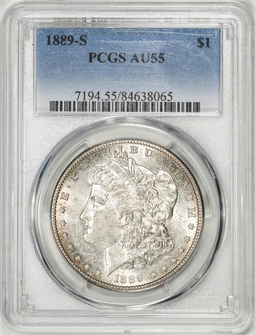 One 1889-S $1 Morgan Silver Dollar Coin PCGS AU55. PCGS Graded.