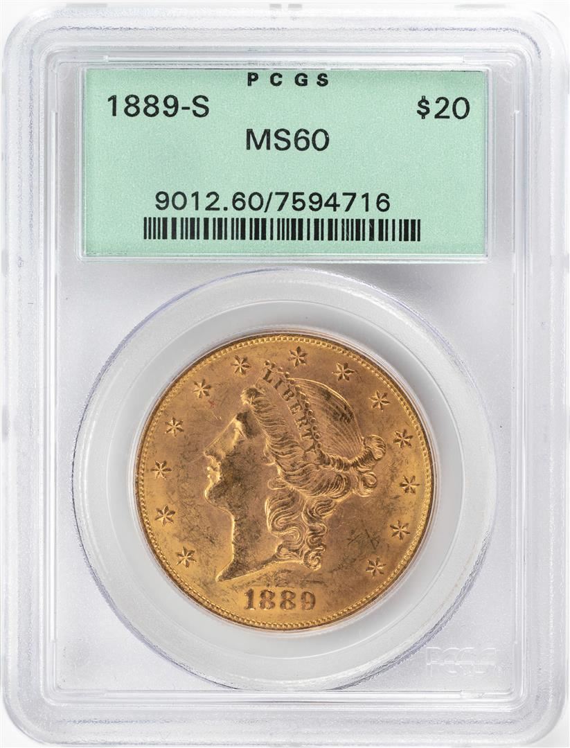 One 1889-S $20 Liberty Head Double Eagle Gold Coin PCGS MS60 OGH. PCGS Graded.