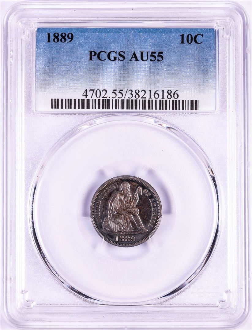 One 1889 Seated Liberty Dime Coin PCGS AU55. PCGS Graded.