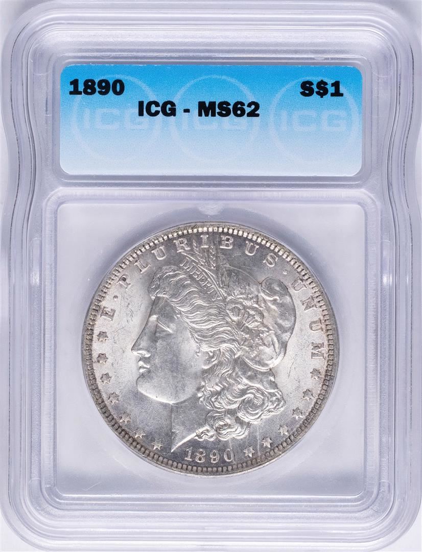 One 1890 $1 Morgan Silver Dollar Coin ICG MS62. ICG Certified.