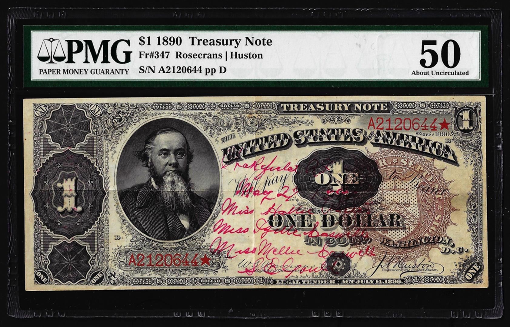 One 1890 $1 Treasury Note Fr.347 PMG About Uncirculated 50. PMG Certified.