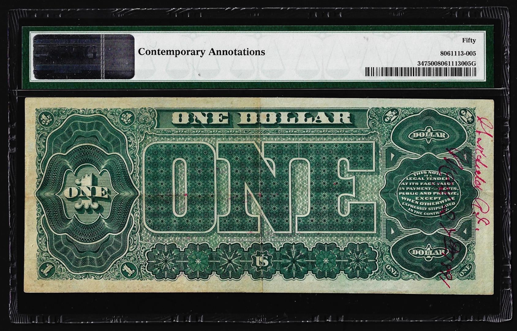 One 1890 $1 Treasury Note Fr.347 PMG About Uncirculated 50. PMG Certified.