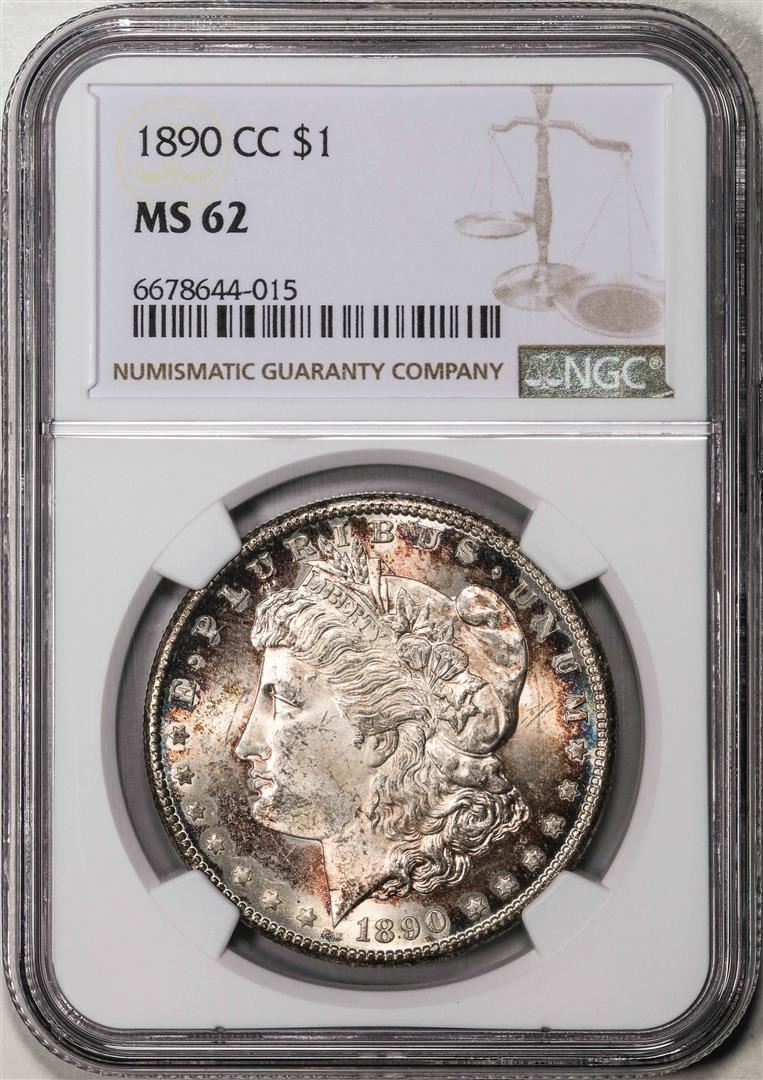 One 1890-CC $1 Morgan Silver Dollar Coin NGC MS62 Nice Toning. NGC Certified.