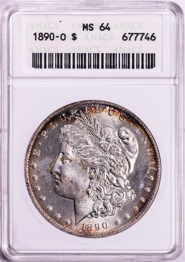 One 1890-O $1 Morgan Silver Dollar Coin ANACS MS64 Nice Toning Old Soap Box Holder. ANACS Certified.