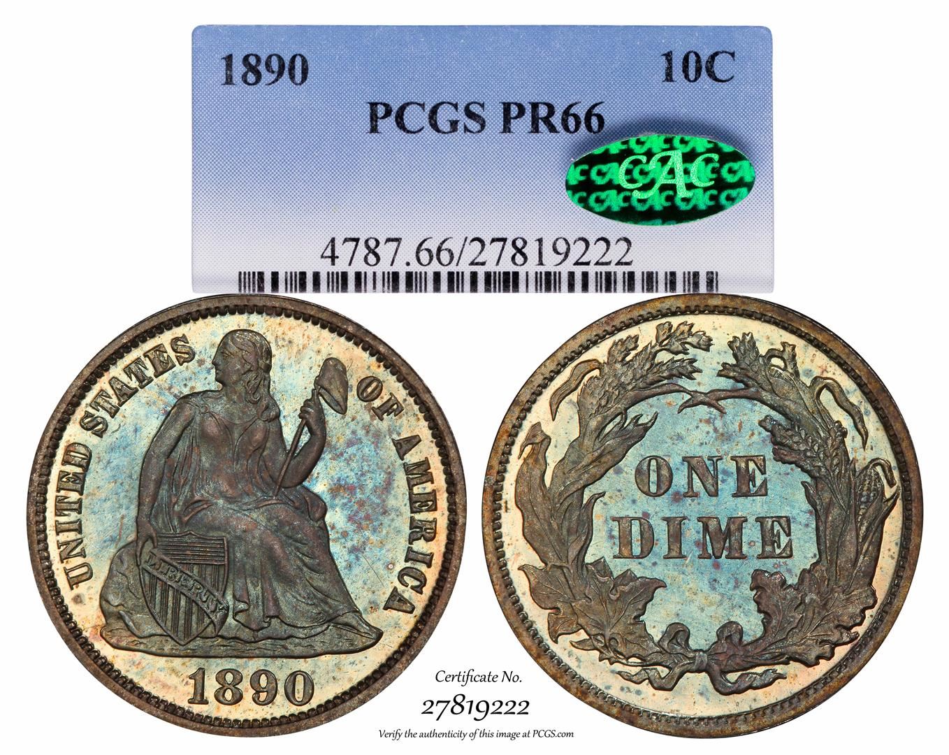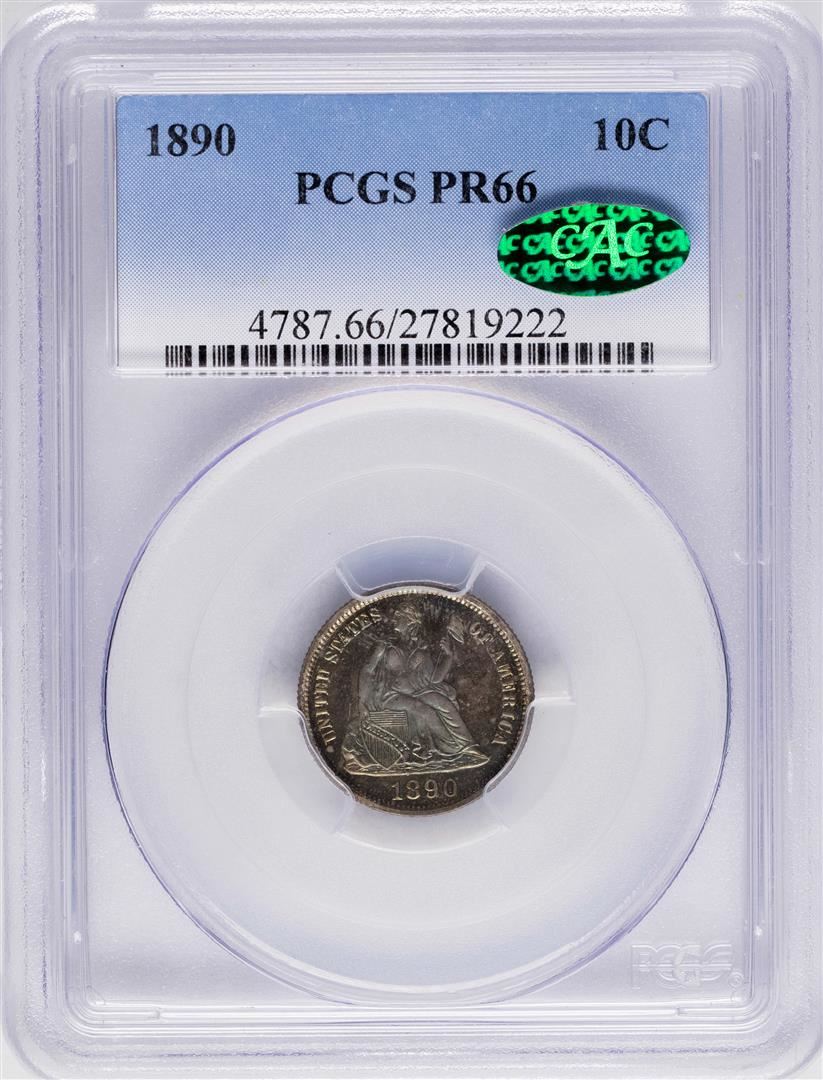 One 1890 Proof Seated Liberty Dime Coin Arrows PCGS PR66 CAC Amazing Toning. PCGS Graded.