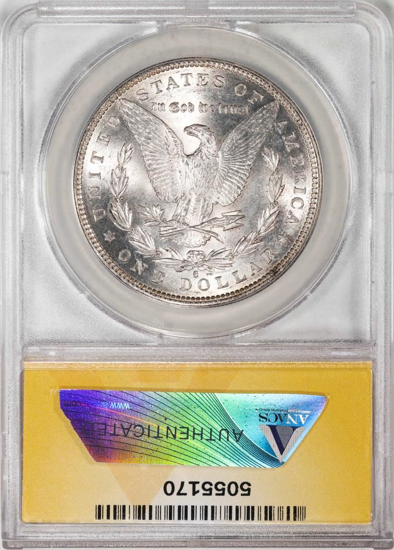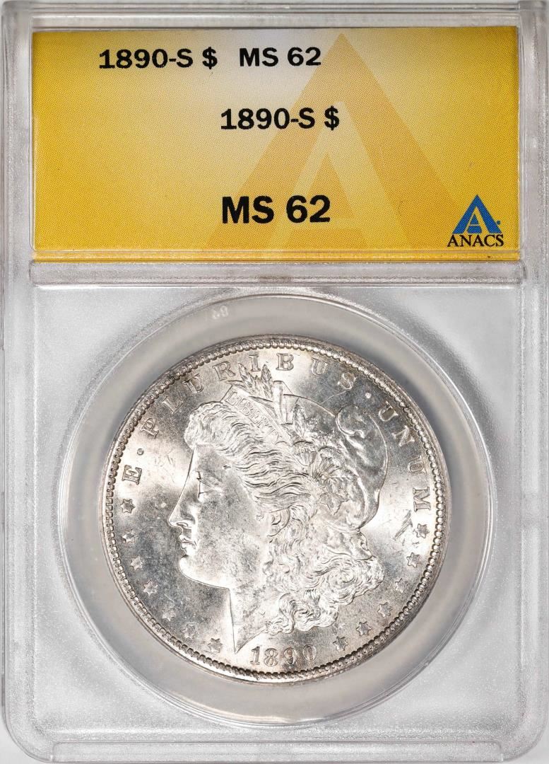 One 1890-S $1 Morgan Silver Dollar Coin ANACS MS62. ANACS Certified.