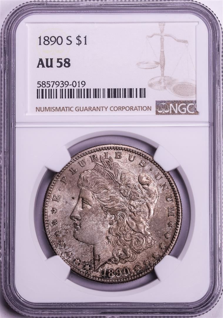 One 1890-S $1 Morgan Silver Dollar Coin NGC AU58. NGC Certified.