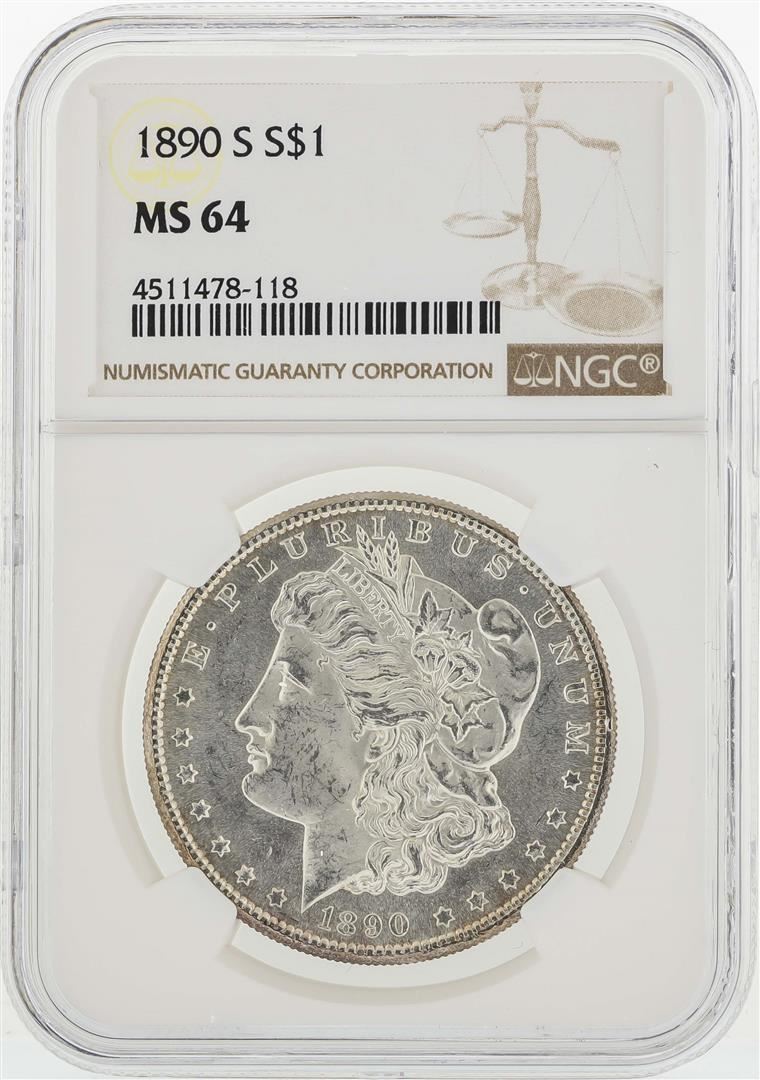 One 1890-S $1 Morgan Silver Dollar Coin NGC MS64. NGC Certified.