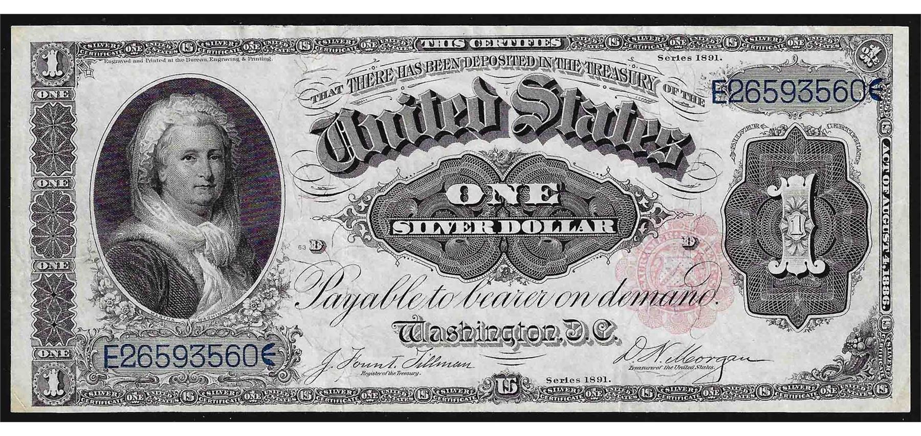 One 1891 $1 Martha Washingon Silver Certificate Note.