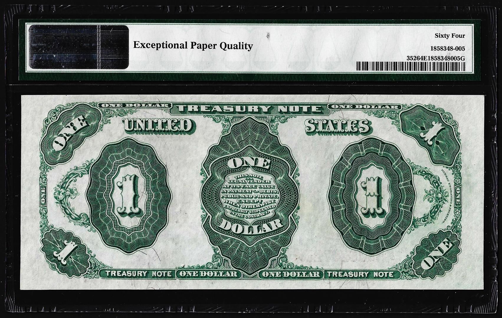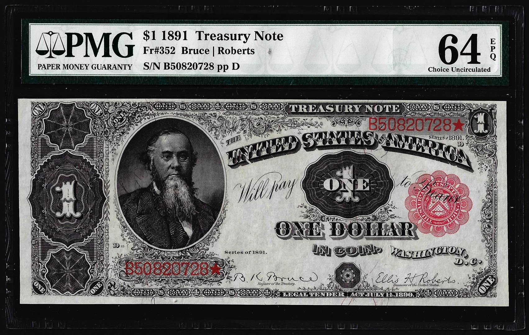 One 1891 $1 Treasury Note Fr. 352 PMG Choice Uncirculated 64EPQ. PMG Certified.