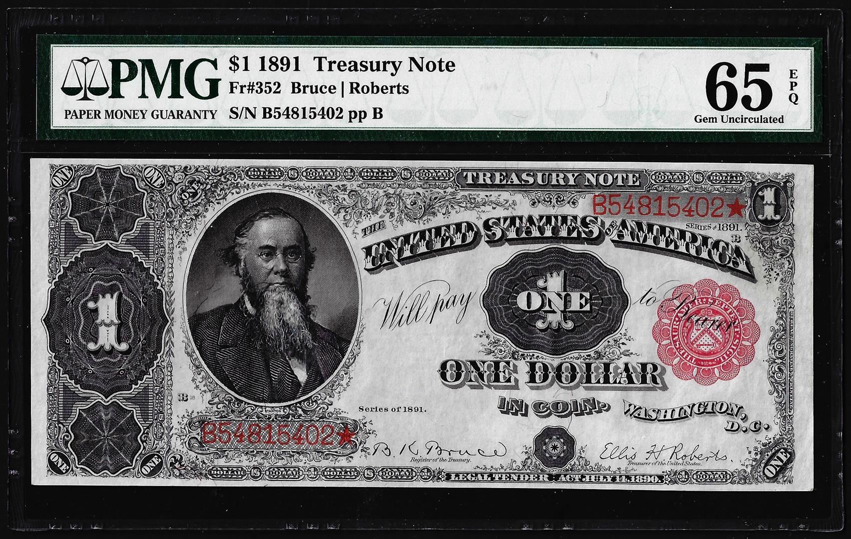 One 1891 $1 Treasury Note Fr.352 PMG Gem Uncirculated 65EPQ. PMG Certified.