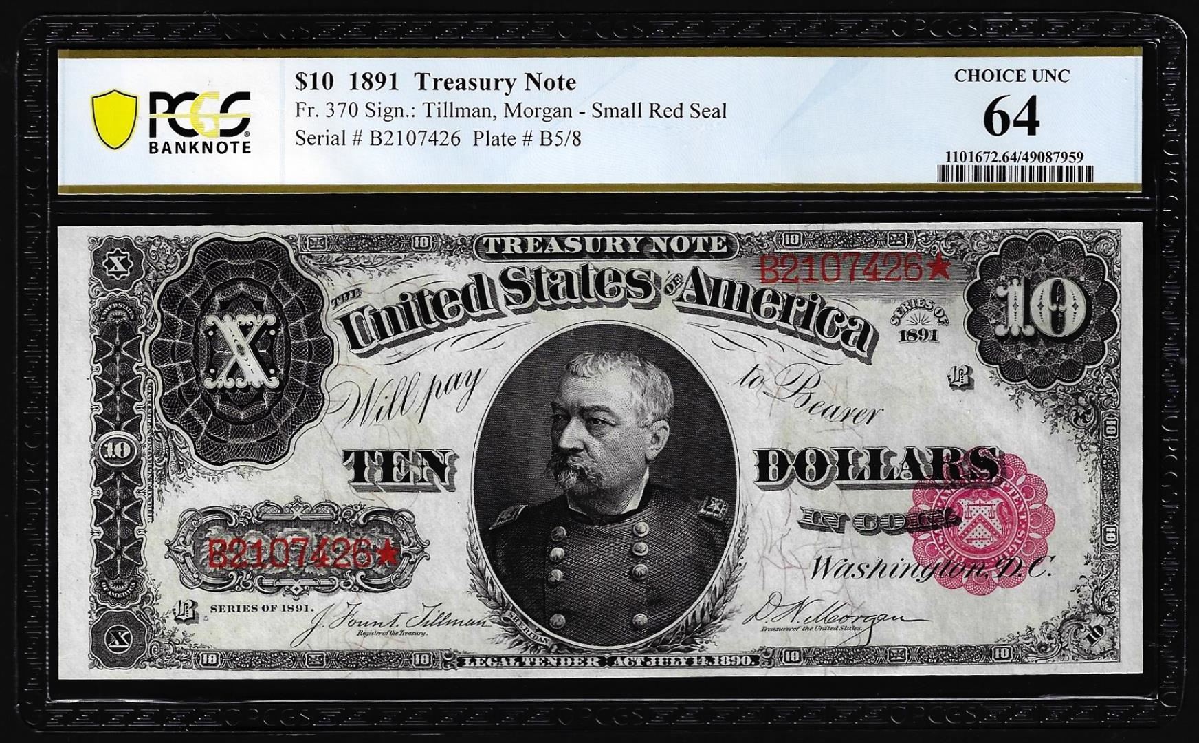 One 1891 $10 Treasury Note Fr.370 PCGS Choice Uncirculated 64. PCGS Graded.