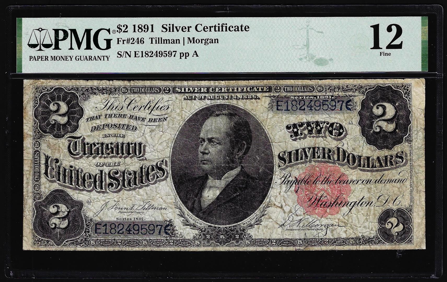 One 1891 $2 Windom Silver Certificate Note Fr.246 PMG Fine 12. PMG Certified.