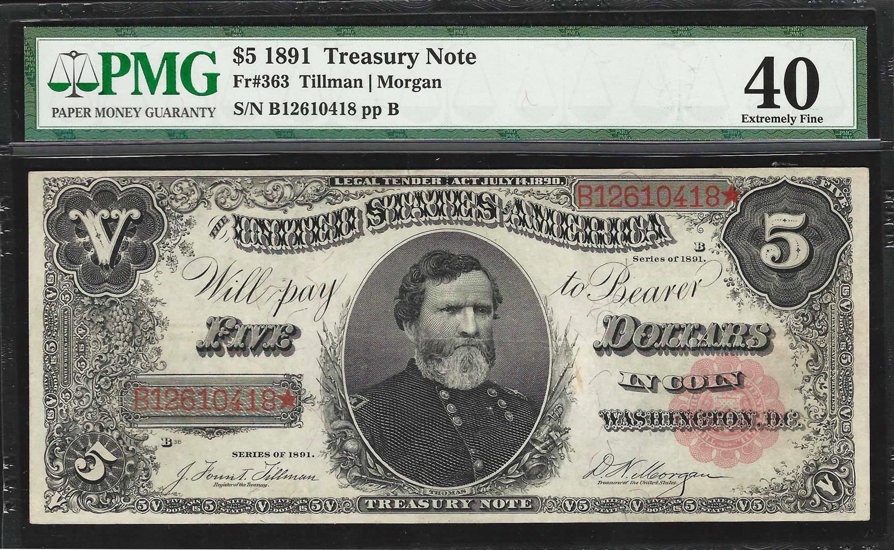 One 1891 $5 Treasury Note Fr.363 PMG Extremely Fine 40. PMG Certified.
