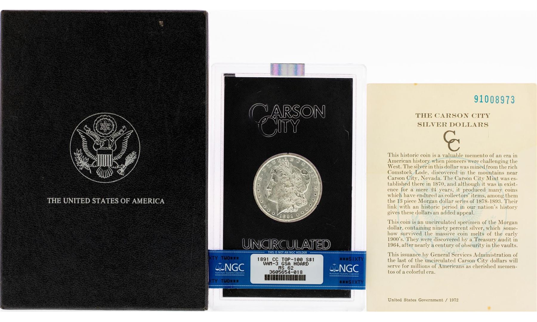 One 1891-CC $1 Morgan Silver Dollar Coin GSA Hoard NGC MS62 Top-100 VAM-3 w/Box & COA. NGC Certified.