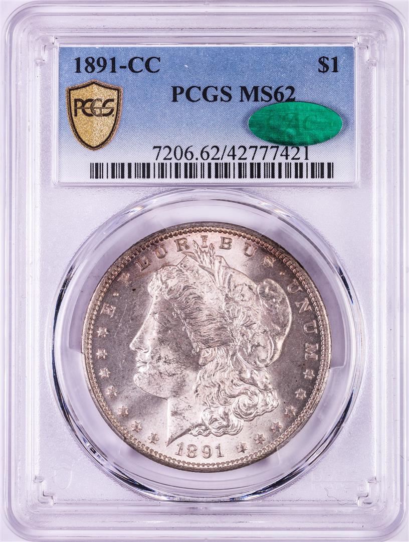 One 1891-CC $1 Morgan Silver Dollar Coin PCGS MS62 CAC. PCGS Graded.