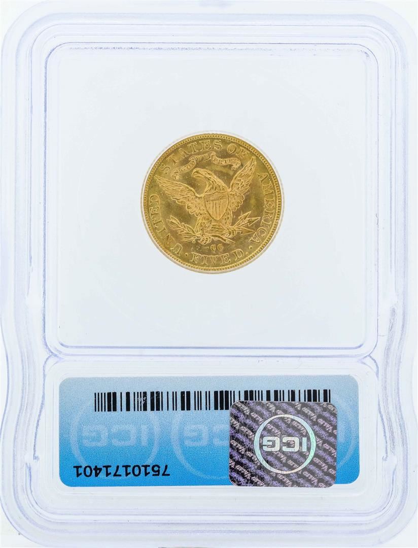 One 1891-CC $5 Liberty Head Half Eagle Gold Coin ICG MS65. ICG Certified.