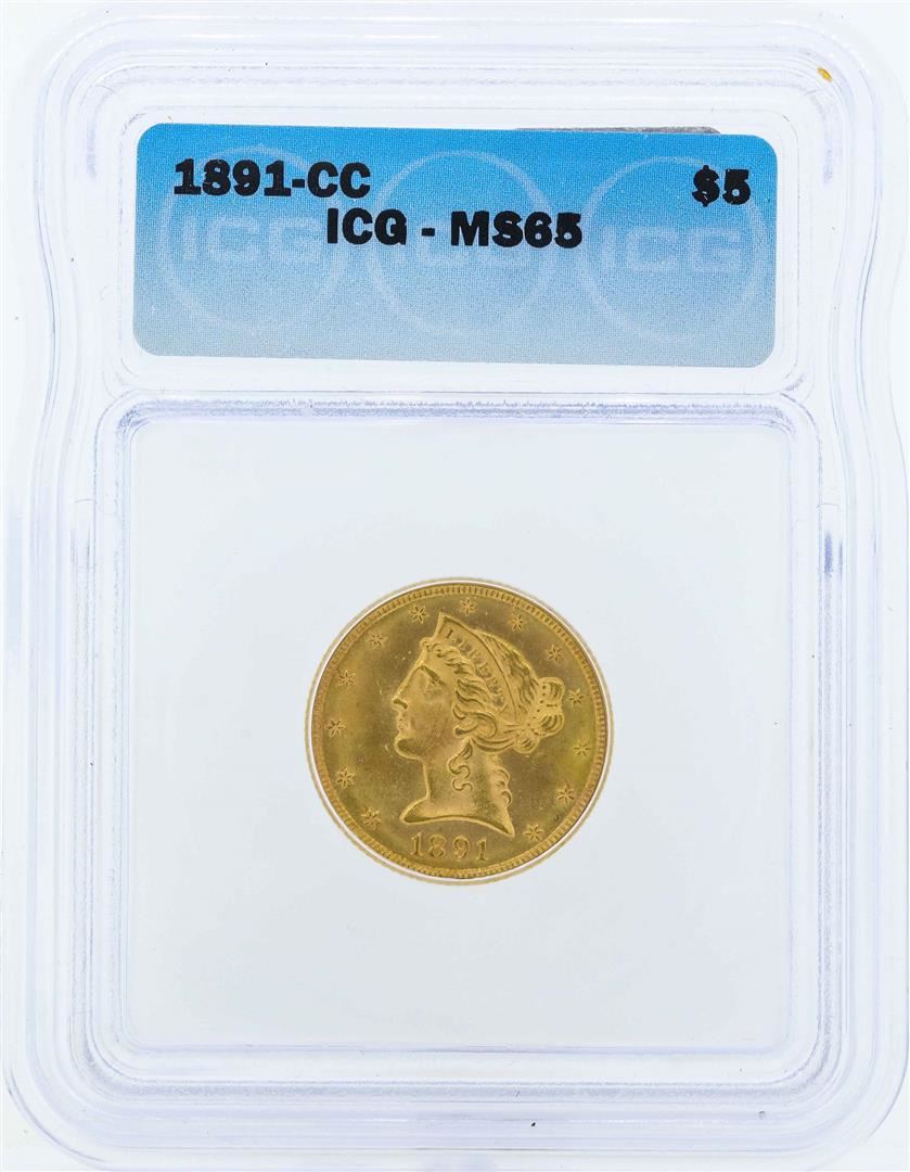 One 1891-CC $5 Liberty Head Half Eagle Gold Coin ICG MS65. ICG Certified.