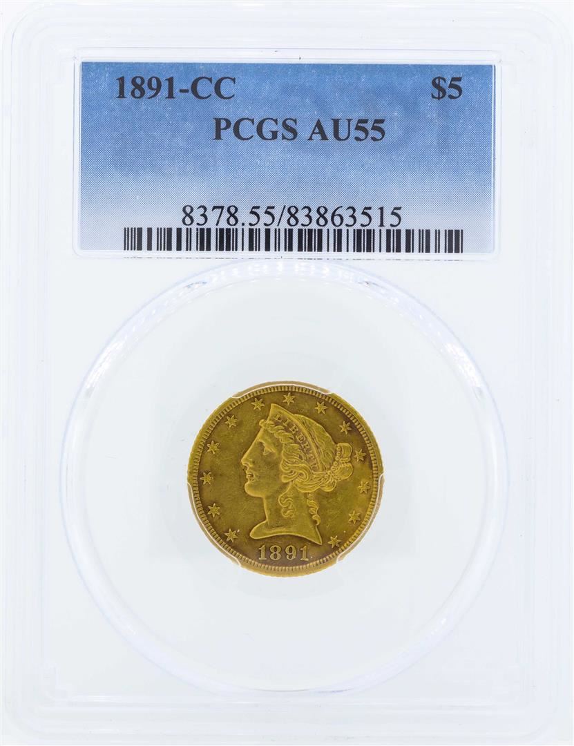 One 1891-CC $5 Liberty Head Half Eagle Gold Coin PCGS AU55. PCGS Graded.