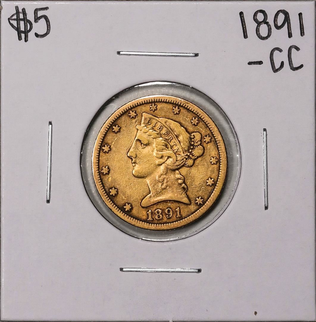 One 1891-CC $5 Liberty Head Half Eagle Gold Coin.