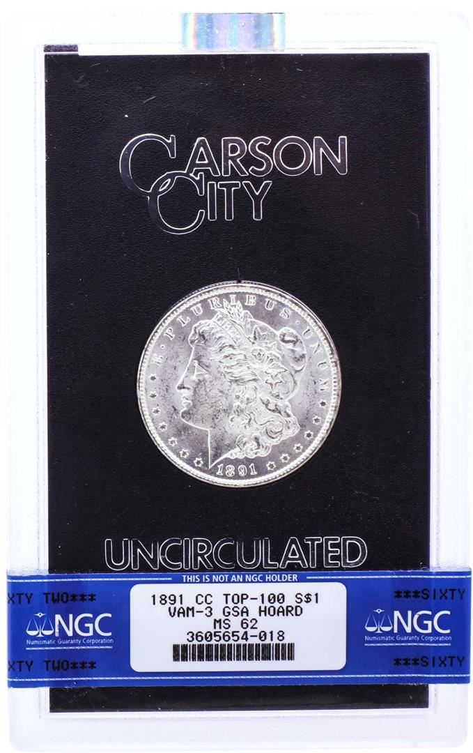 One 1891-CC VAM-3 $1 Morgan Silver Dollar Coin GSA Hoard NGC MS62 with Box & COA. NGC Certified.