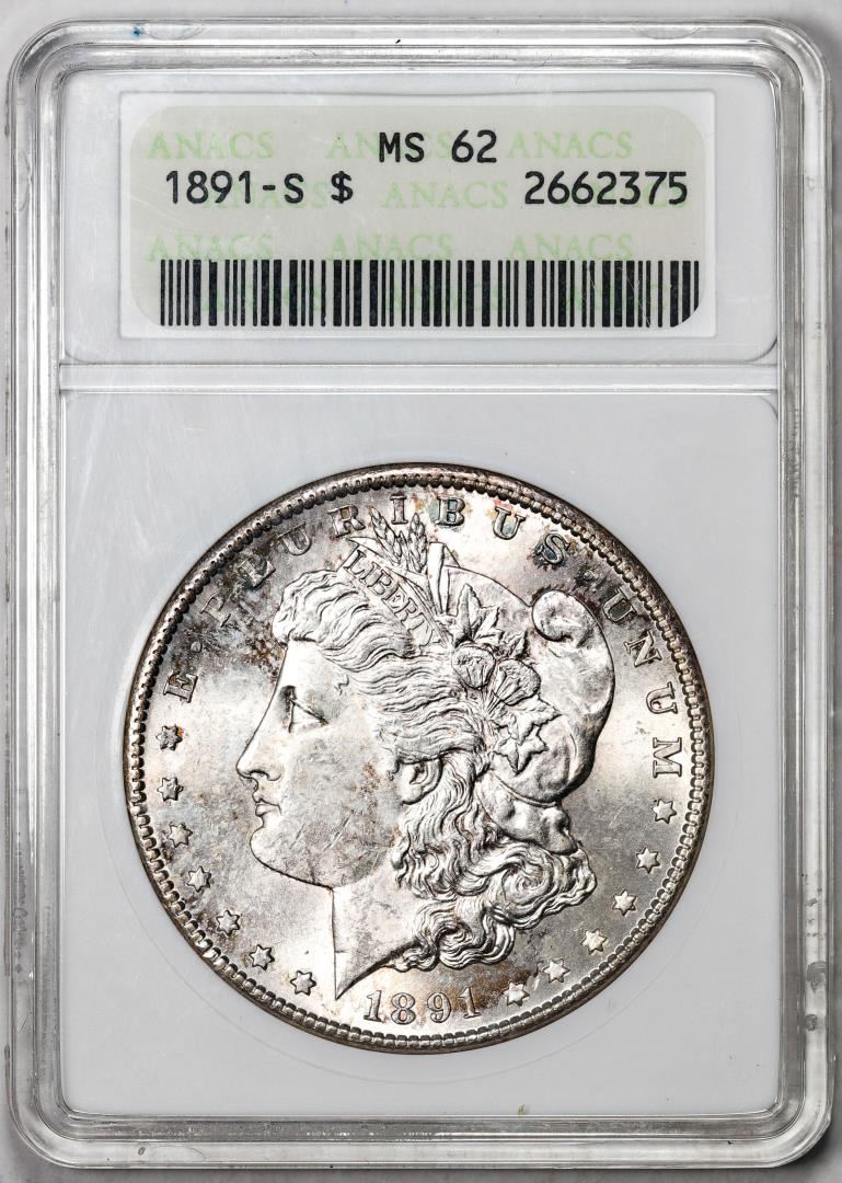 1891-S $1 Morgan Silver Dollar Coin ANACS MS62 Old Soap Box Holder