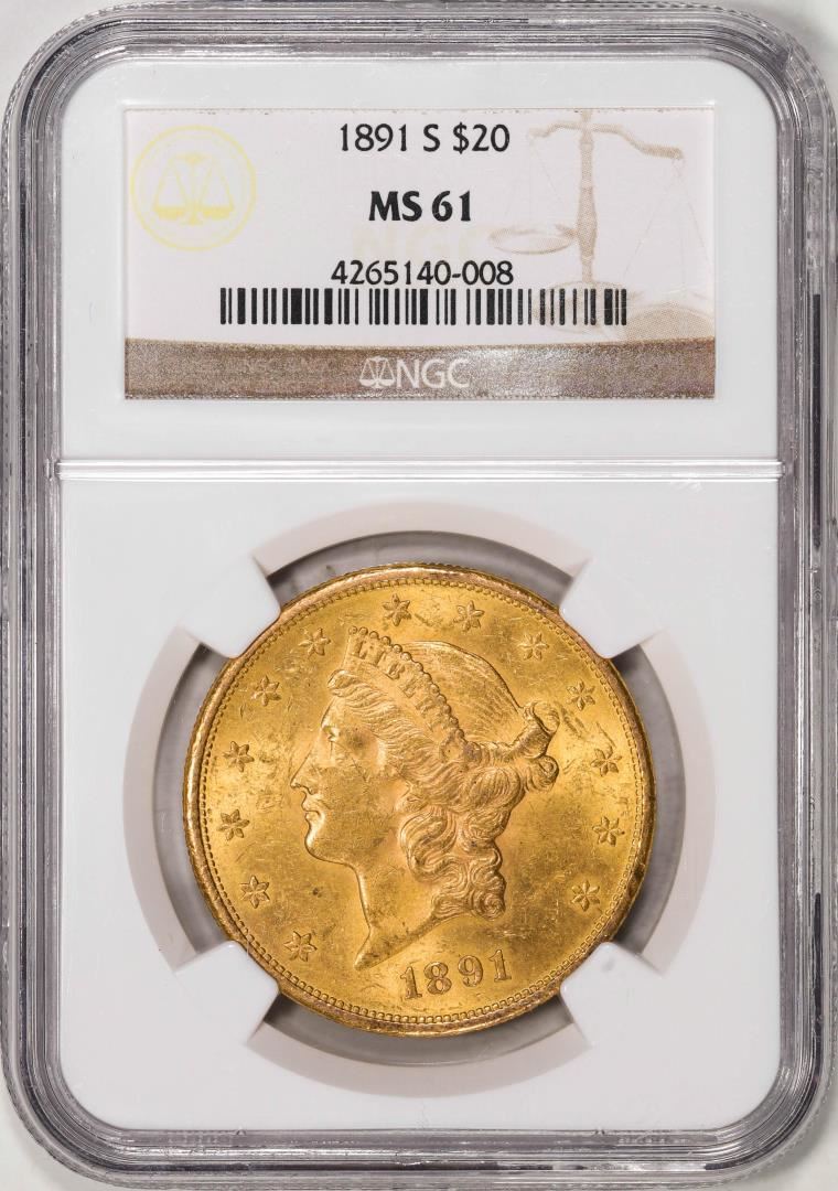 One 1891-S $20 Liberty Head Double Eagle Gold Coin NGC MS61. NGC Certified.