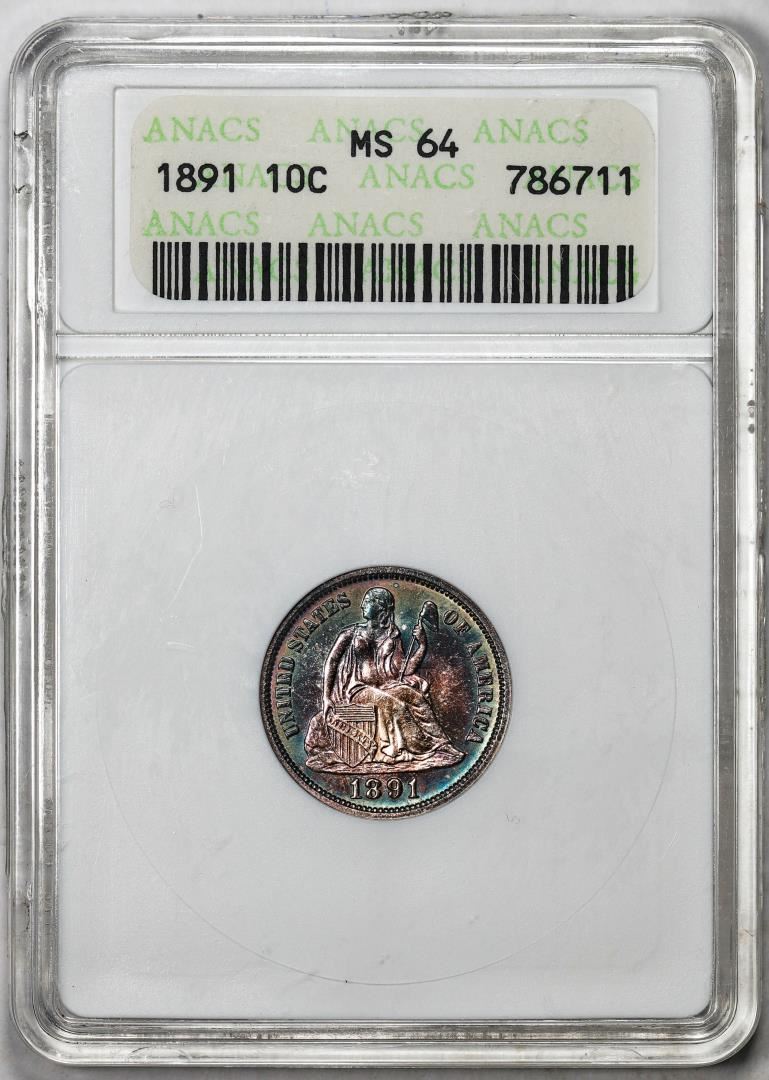 1891 Seated Liberty Dime Coin ANACS MS64 Amazing Toning Old Soap Box Holder