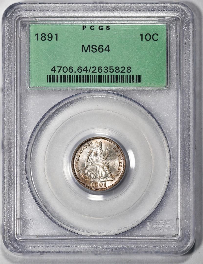 1891 Seated Liberty Dime Coin PCGS MS64 Old Green Holder
