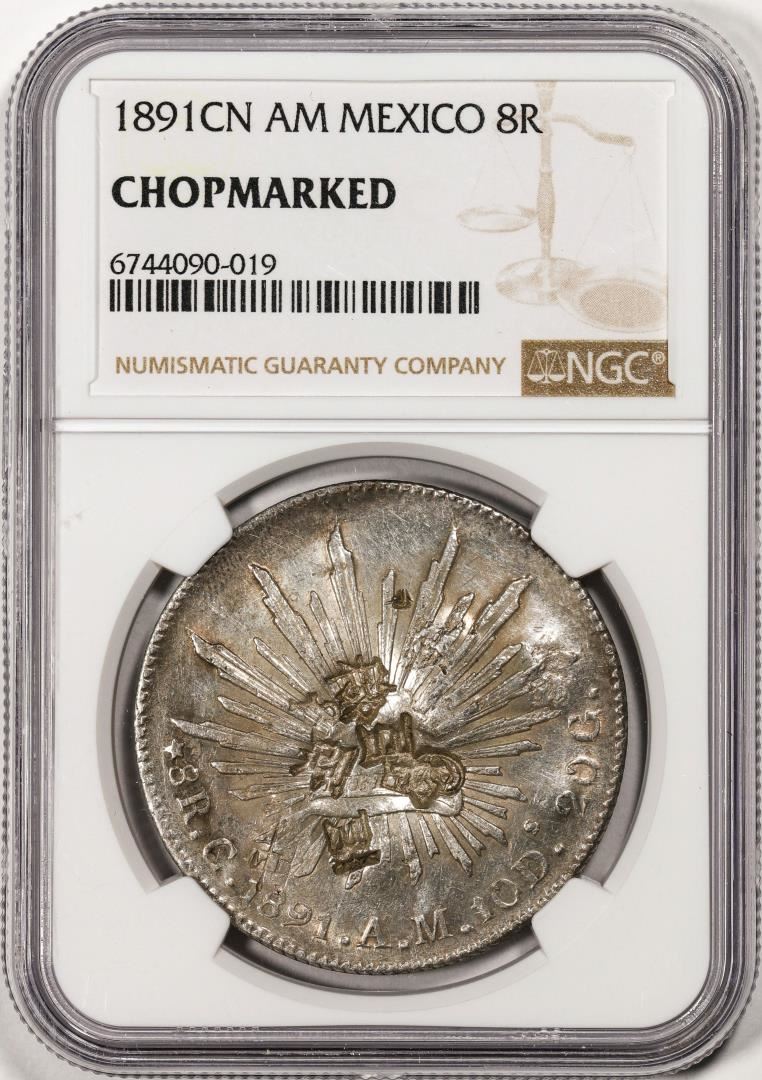 One 1891CN AM Mexico 8 Reales Silver Coin NGC Chopmarked. NGC Certified.