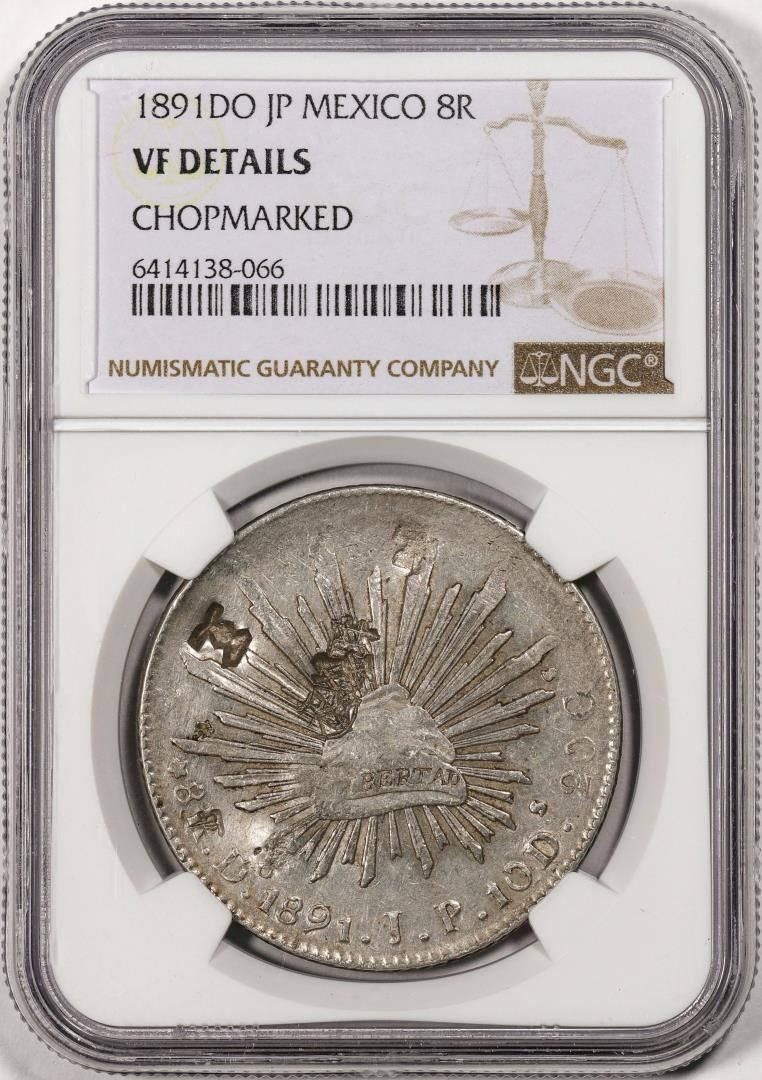 One 1891DO JP Mexico 8 Reales Silver Coin NGC VF Details Chopmarked. NGC Certified.