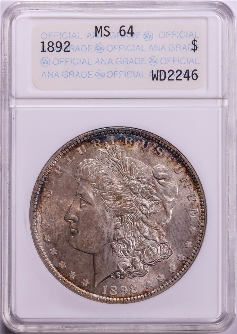 One 1892 $1 Morgan Silver Dollar Coin ANACS MS64 Old Soap Box Holder Nice Toning. ANACS Certified.