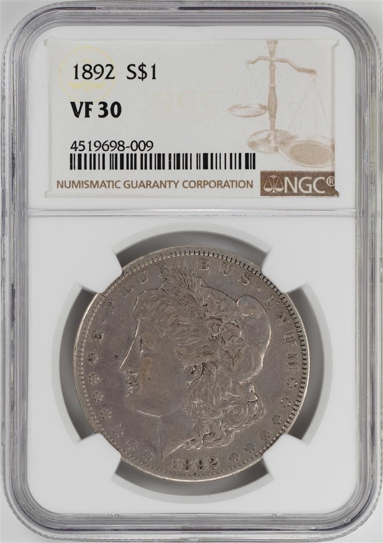 One 1892 $1 Morgan Silver Dollar Coin NGC VF30. NGC Certified.