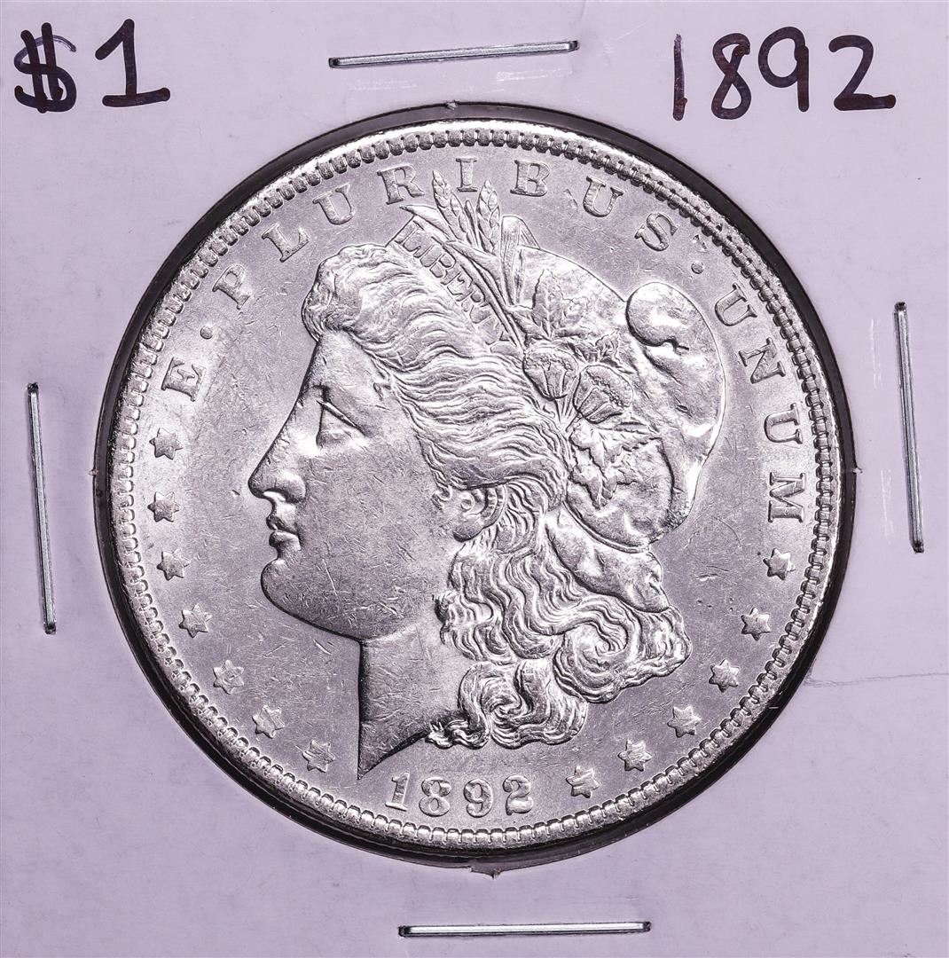 One 1892 $1 Morgan Silver Dollar Coin.