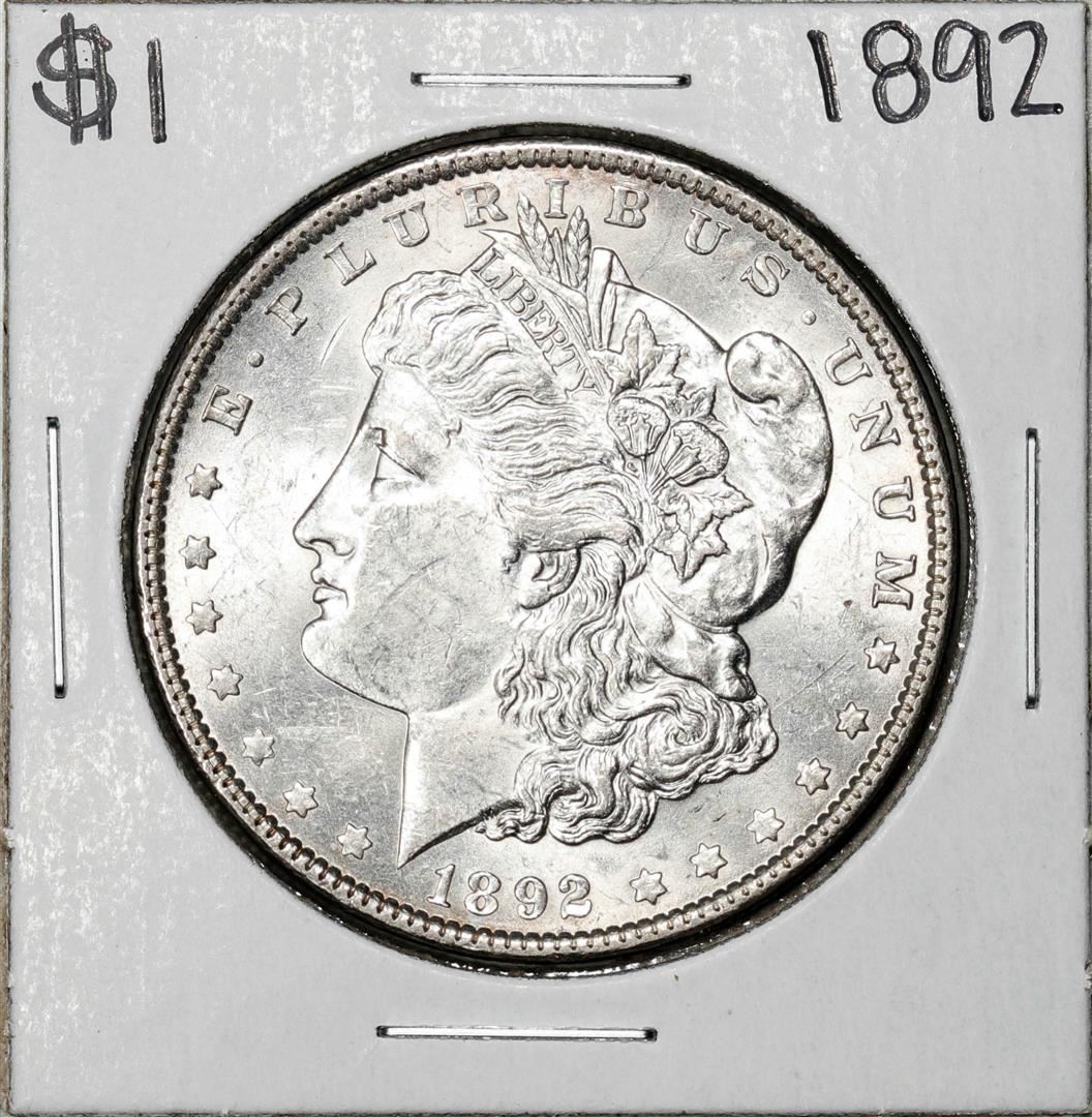 One 1892 $1 Morgan Silver Dollar Coin.