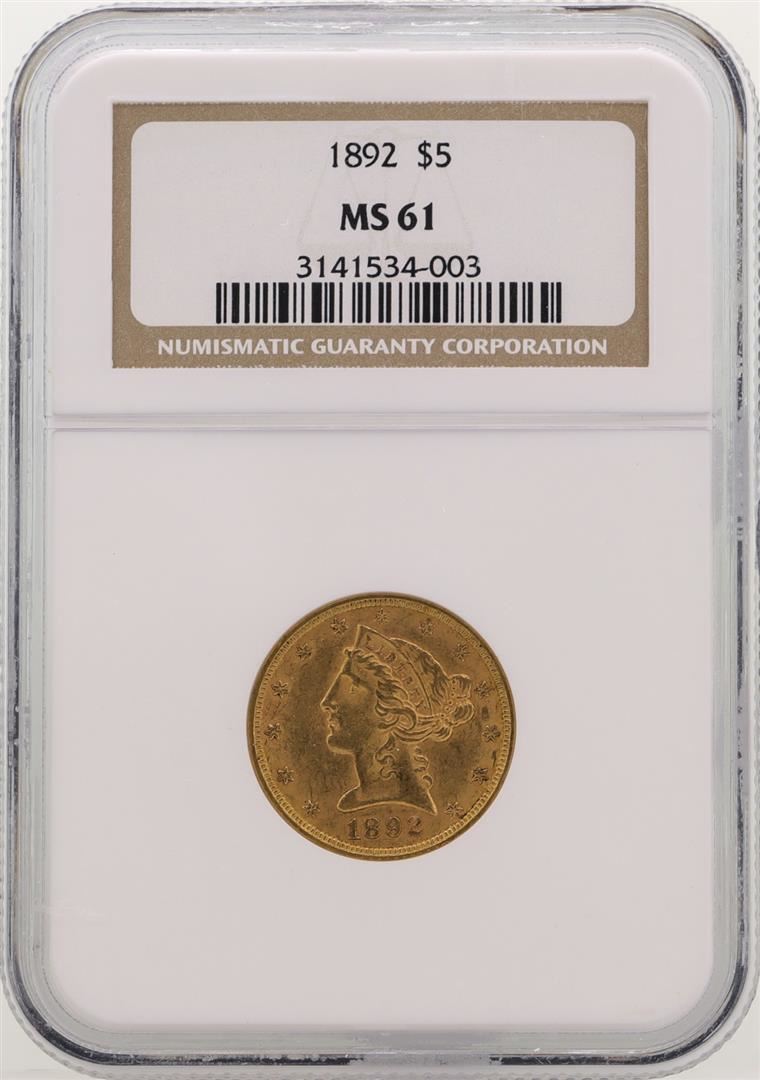 One 1892 $5 Liberty Head Half Eagle Gold Coin NGC MS61. NGC Certified.