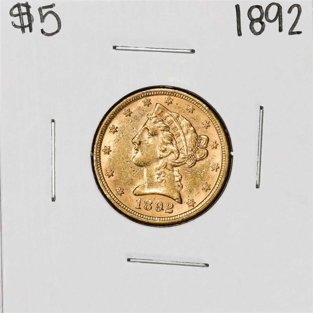 One 1892 $5 Liberty Head Half Eagle Gold Coin.