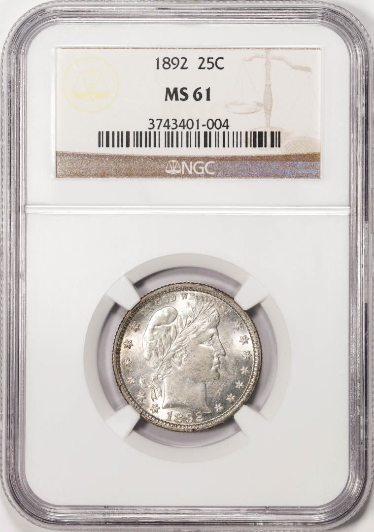 One 1892 Barber Quarter Coin NGC MS61. NGC Certified.