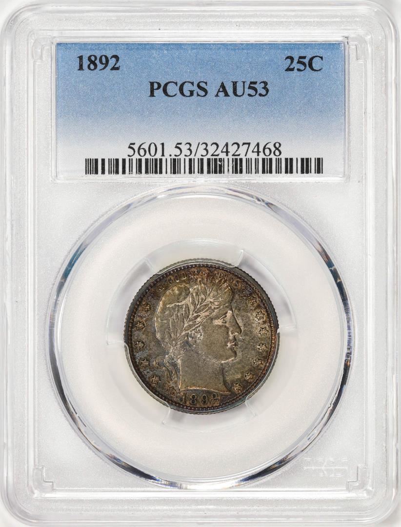 One 1892 Barber Quarter Coin PCGS AU53 Nice Color. PCGS Graded.