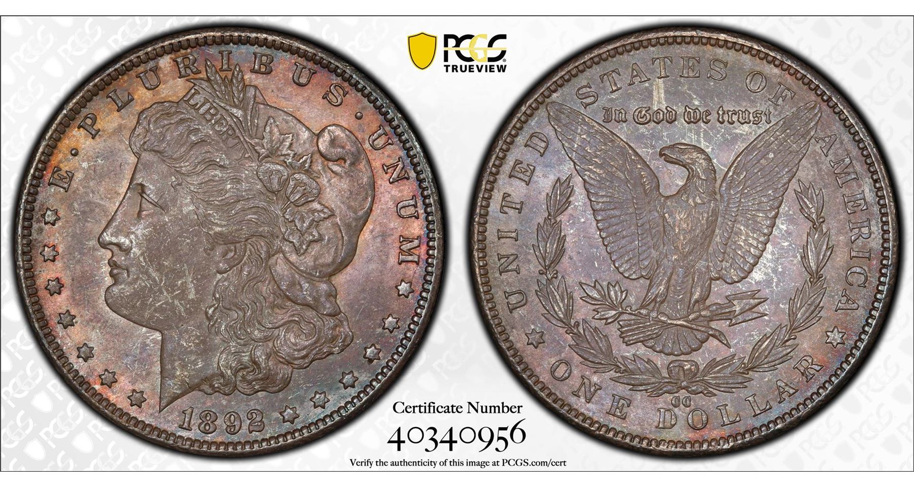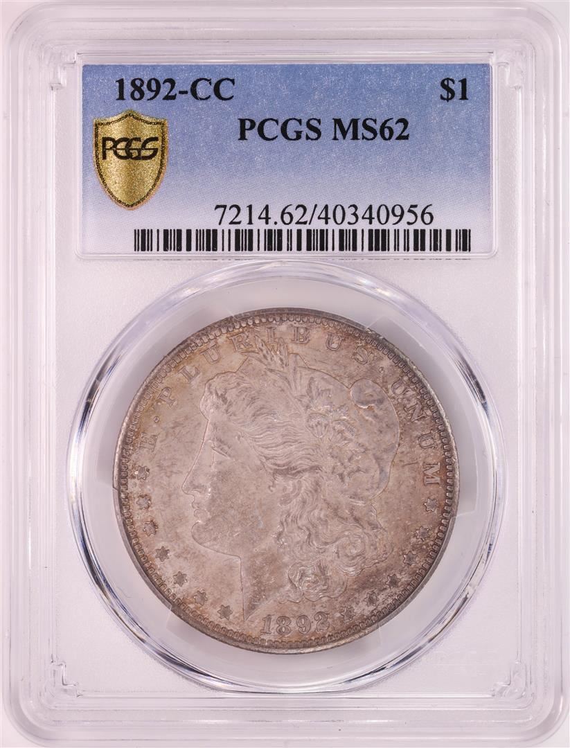 One 1892-CC $1 Morgan Silver Dollar Coin PCGS MS62. This 1892-CC is boldly toned in deep pewter gray, both sides reveal more vivid undertones of pinkish-apricot and/or powder blue as the coin dips into a light. The coin has a sharp strike with exceptional mint luster. PCGS Graded.