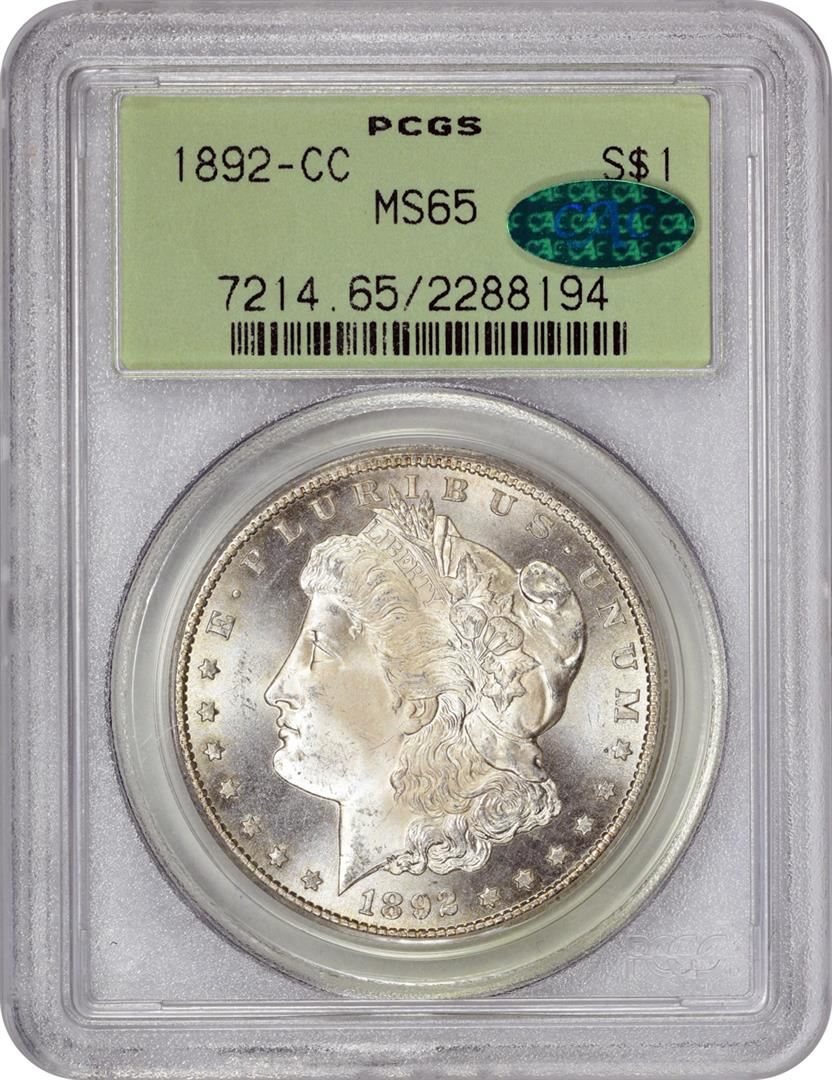 One 1892-CC $1 Morgan Silver Dollar Coin PCGS MS65 CAC Old Green Holder. PCGS Graded.