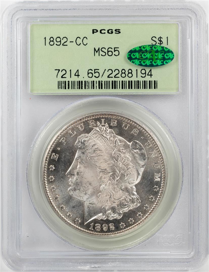 One 1892-CC $1 Morgan Silver Dollar Coin PCGS MS65 CAC Old Green Holder. PCGS Graded.