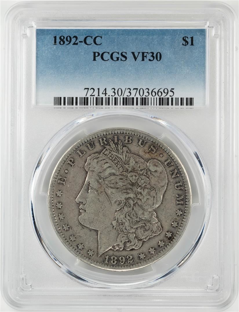 One 1892-CC $1 Morgan Silver Dollar Coin PCGS VF30. PCGS Graded.