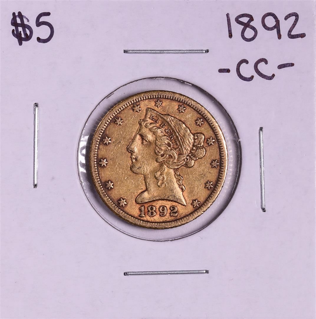 One 1892-CC $5 Liberty Head Half Eagle Gold Coin.