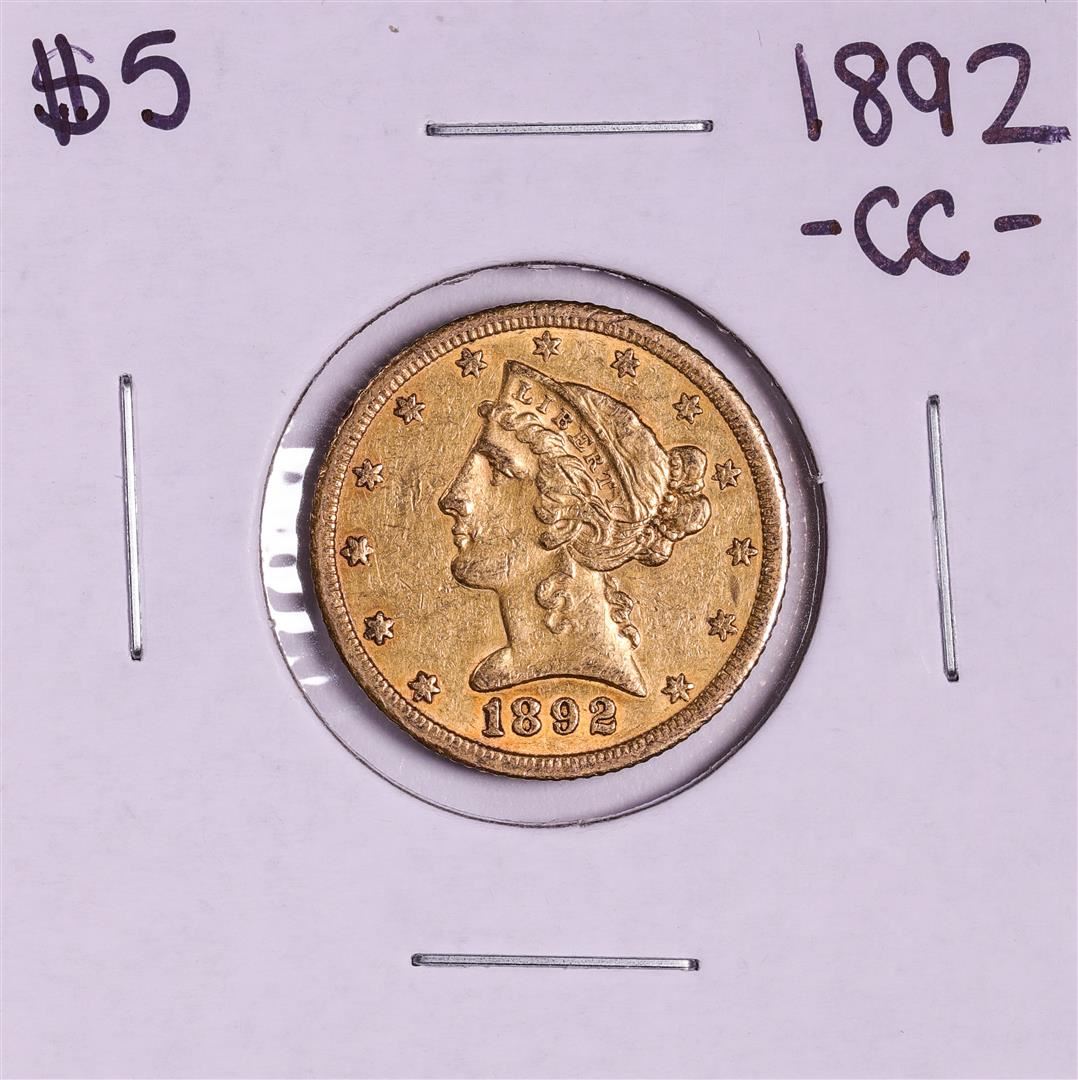 One 1892-CC $5 Liberty Head Half Eagle Gold Coin.