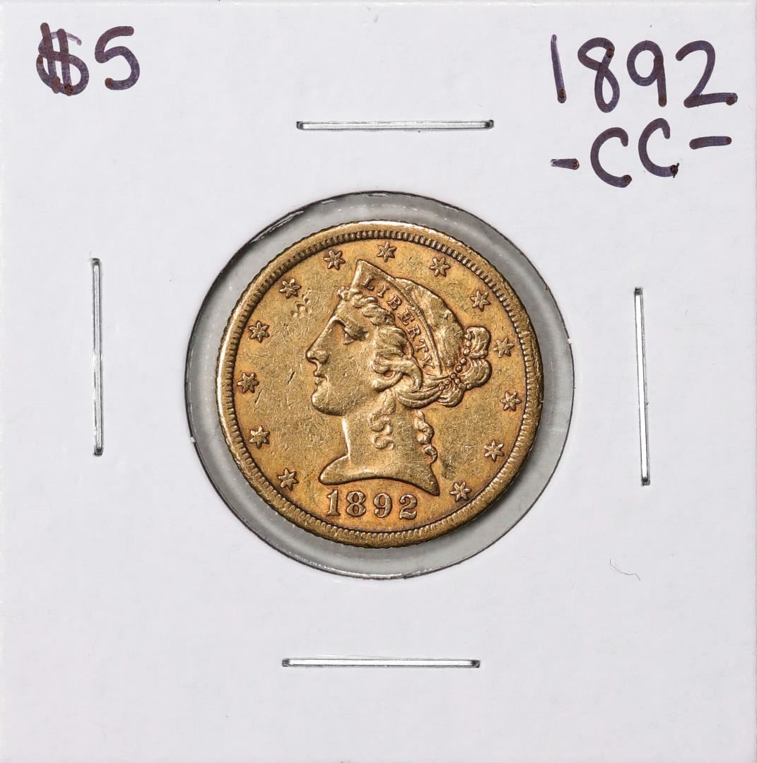 One 1892-CC $5 Liberty Head Half Eagle Gold Coin.
